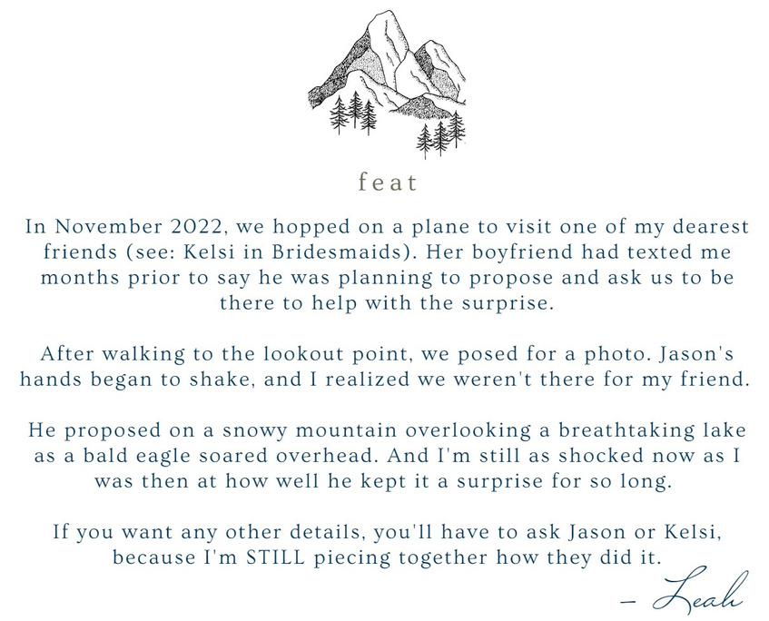 In November 2022, we hopped on a plane to Colorado to visit one of my dearest friends (see: Kelsi in Bridesmaids). Due to trickery crafted by Kelsi & Jason, I believed (for months!) that we were on our way to help create a surprise, mountain-top proposal for Kelsi.